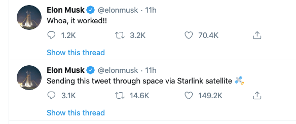 SpaceX CEO Elon Musk has a Starlink terminal at his house and he used it to send a tweet early on Oct. 22.”Sending this tweet through space via Starlink satellite,” he tweeted to his 29 million followers. ”Whoa, it worked!!”